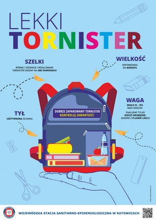 Państwowy Powiatowy Inspektor Sanitarny w Wodzisławiu Śląskim zwraca uwagę na przeciążone plecaki uczniów. Kształtowanie prawidłowej postawy ciała jest jednym z warunków właściwego rozwoju fizycznego dziecka. Zgodnie z zaleceniami Głównego Inspektora Sanitarnego waga plecaka nie powinna przekraczać 10-15 procent masy ciała ucznia. Tornister powinien posiadać ergonomiczną, odpowiednio usztywnioną ściankę przylegającą do pleców. Zaleca się, by tornister miał równe, szerokie szelki, których długość umożliwi uczniowi jego swobodne wkładanie i zdejmowanie, jednocześnie zapewniając jak najlepsze przyleganie plecaka do pleców. Doradza się również dodatkowe zapięcie spinające szelki z przodu klatki piersiowej.