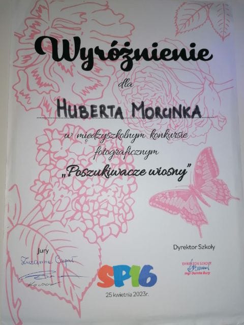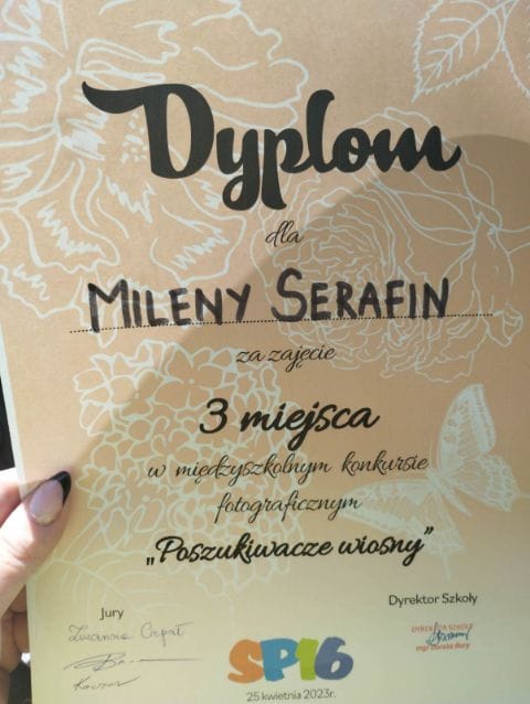 Uczniowie naszej szkoły Milena Serafin i Hubert Morcinek zostali nagrodzeni w konkursie fotograficznym "Poszukiwacze wiosny", którego organizatorem była Szkoła Podstawowa nr 16 w Jastrzębiu-Zdroju.